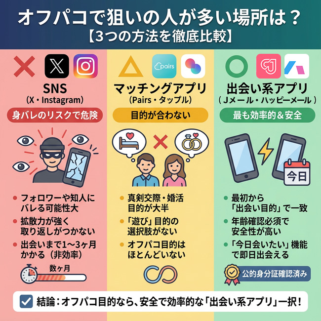 オフパコの出会いを探す方法は大きく分けて3つあります。それぞれにメリット・デメリットがあり、選び方を間違えると時間とお金を無駄にしてしまいます。